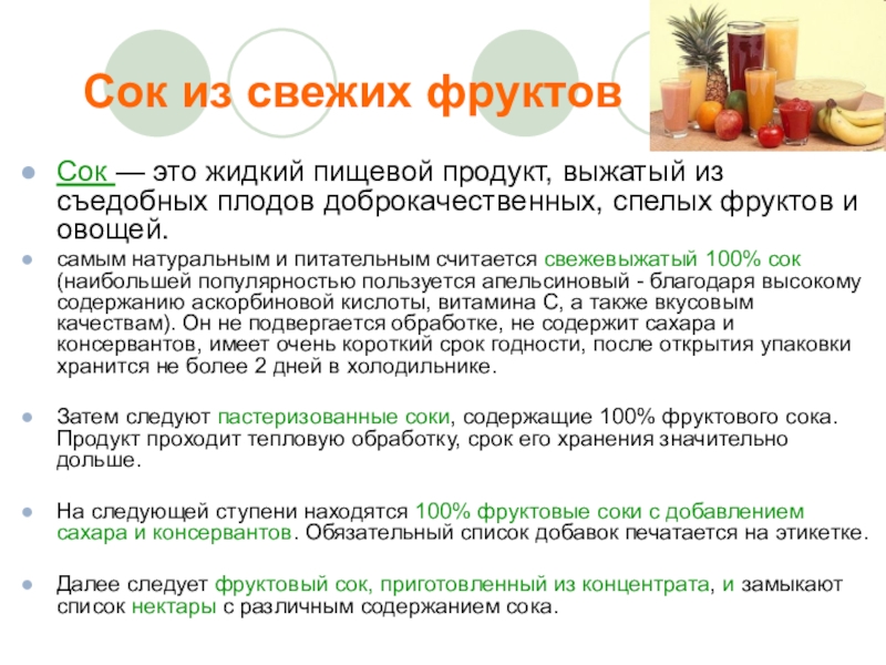 самым натуральным и питательным считается свежевыжатый 100% сок (наибольшей популярностью пользуется апельсиновый - благодаря высокому содержанию аскорбиновой кислоты, витамина С, а также вкусовым качествам). Он не подвергается обработке, не содержит сахара и консервантов, имеет очень короткий срок годности, после открытия упаковки хранится не более 2 дней в холодильнике.