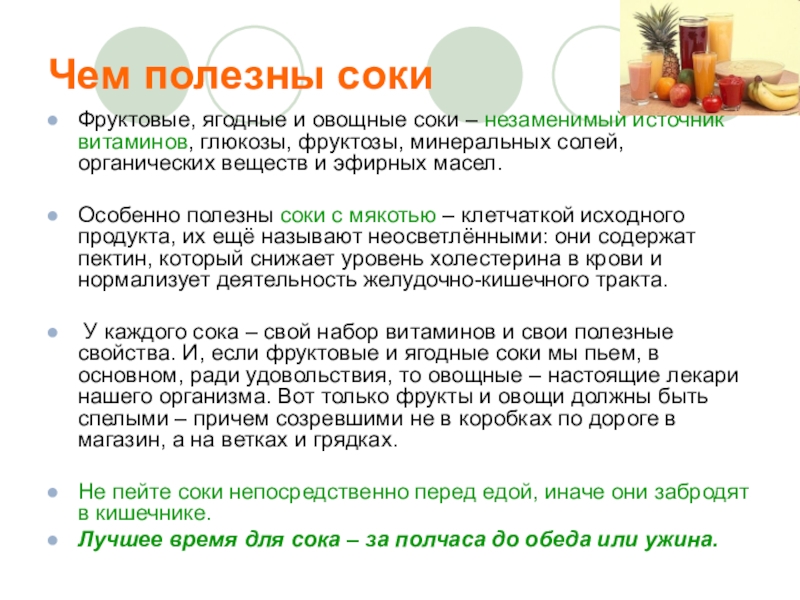 Фруктовые, ягодные и овощные соки – незаменимый источник витаминов,