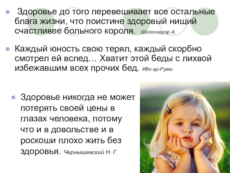 Здоровье никогда не может потерять своей цены в глазах человека, потому что и в довольстве и в роскоши плохо жить без здоровья. Чернышевский Н. Г.
