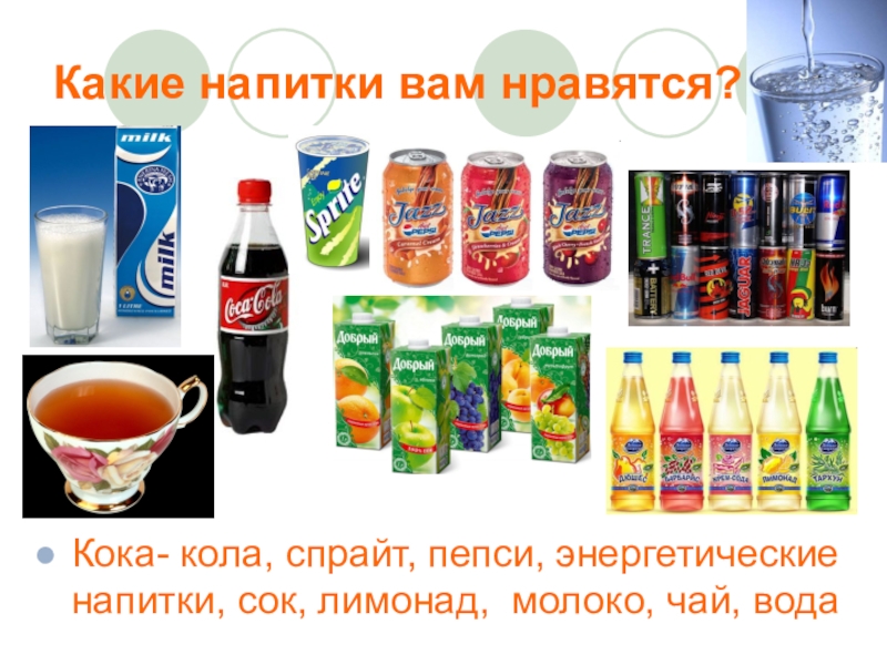 Кока- кола, спрайт, пепси, энергетические напитки, сок, лимонад,