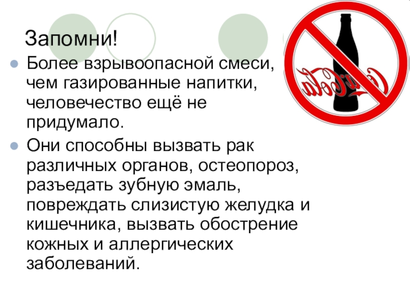 способны вызвать рак различных органов, остеопороз, разъедать зубную эмаль, повреждать слизистую желудка и кишечника, вызвать обострение кожных и аллергических заболеваний.