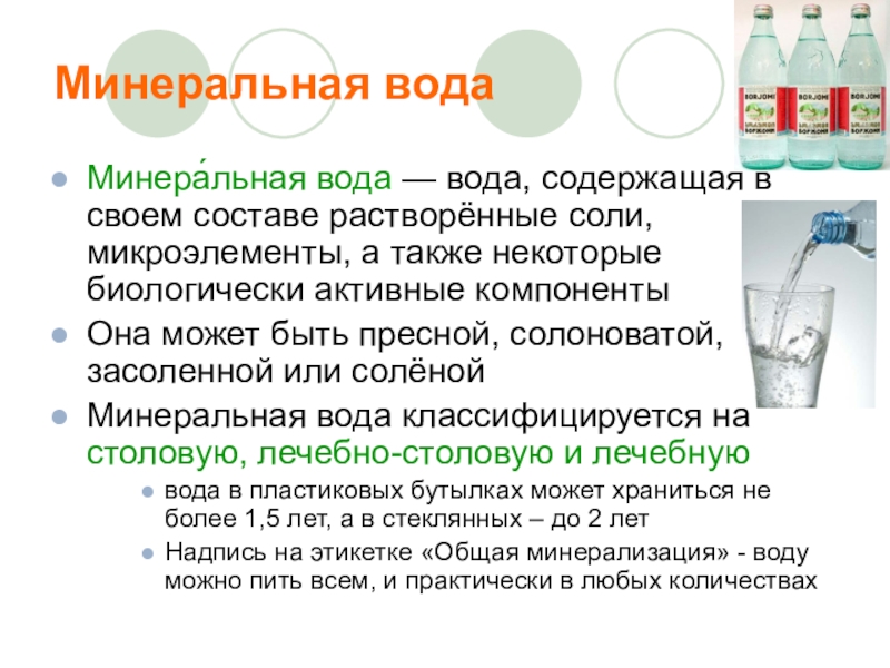 Минера́льная вода — вода, содержащая в своем составе растворённые соли,