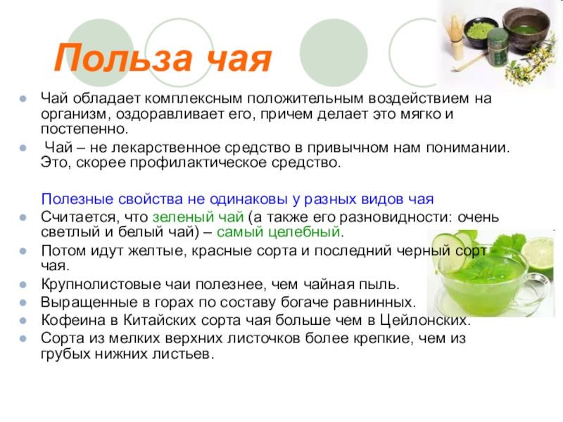 Чай обладает комплексным положительным воздействием на организм, оздоравливает его, причем