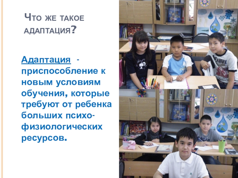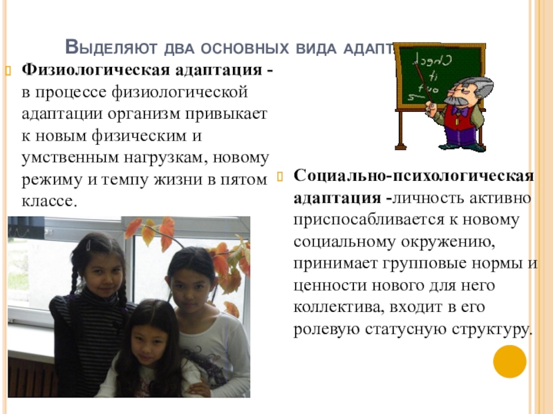 Физиологическая адаптация -в процессе физиологической адаптации организм привыкает к новым физическим и умственным нагрузкам, новому режиму и темпу жизни в пятом классе.