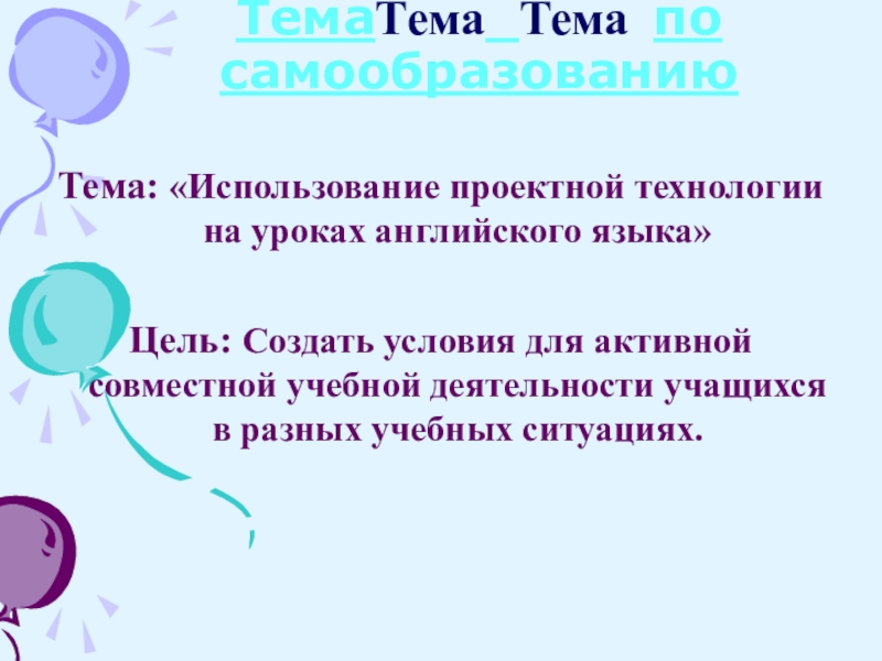 ТемаТема Тема по самообразованию Тема: «Использование проектной технологии на уроках английского языка»Цель: Создать условия для активной совместной
