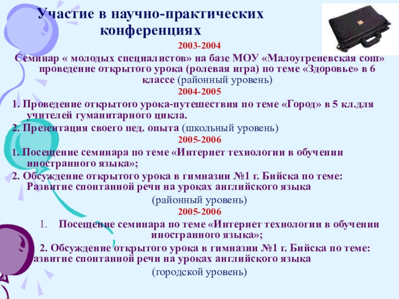Участие в научно-практических конференциях2003-2004 Семинар « молодых специалистов» на базе МОУ «Малоугренёвская сош» проведение открытого урока (ролевая