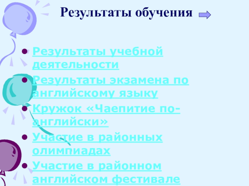 Результаты обученияРезультаты учебной деятельностиРезультаты экзамена по английскому языкуКружок «Чаепитие по-английски»Участие в районных олимпиадахУчастие в районном английском фестивале
