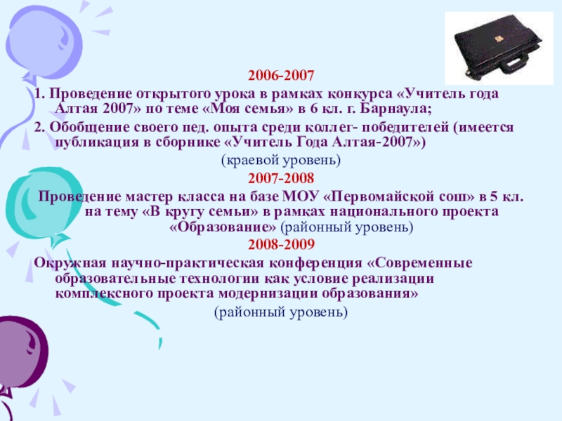 2006-20071. Проведение открытого урока в рамках конкурса «Учитель года Алтая 2007» по теме «Моя семья» в 6