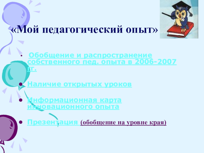 «Мой педагогический опыт» Обобщение и распространение собственного пед. опыта в 2006-2007 гг.Наличие открытых уроковИнформационная карта инновационного опытаПрезентация