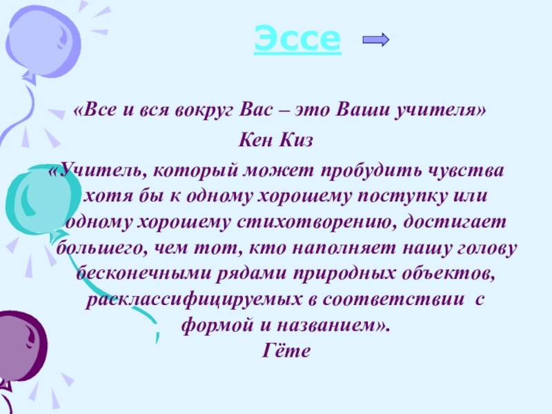Эссе «Все и вся вокруг Вас – это Ваши учителя»Кен Киз«Учитель, который может пробудить чувства хотя бы