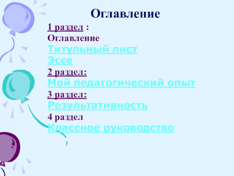 Оглавление 1 раздел :Оглавление Титульный листЭссе2 раздел:Мой педагогический опыт3 раздел:Результативность4 разделКлассное руководство