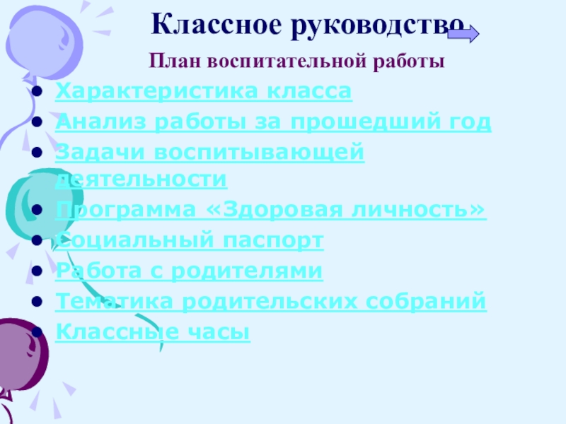 Классное руководство   План воспитательной работыХарактеристика классаАнализ работы за прошедший годЗадачи воспитывающей деятельностиПрограмма «Здоровая личность»Социальный паспортРабота