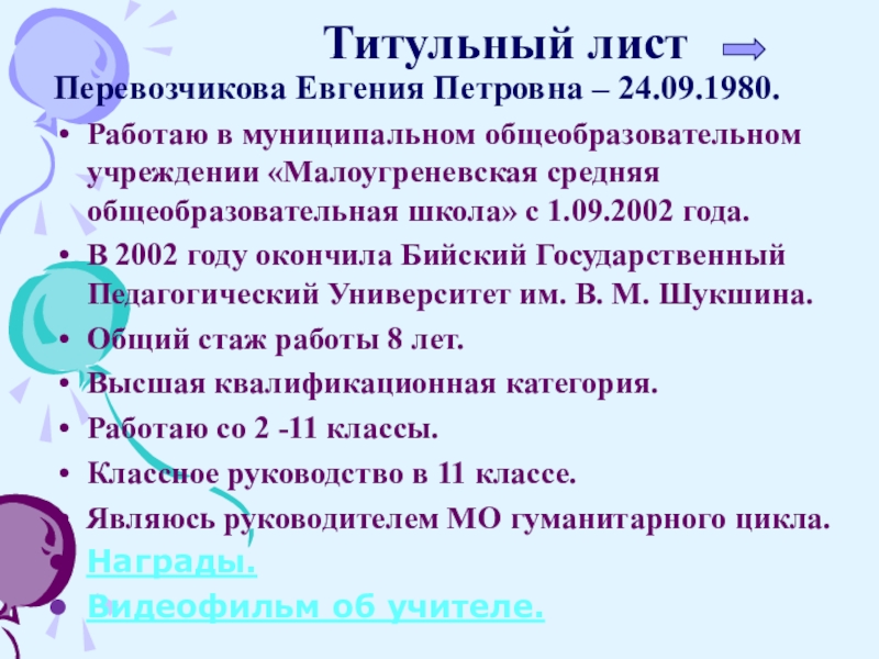 Титульный лист Перевозчикова Евгения Петровна – 24.09.1980.Работаю в муниципальном общеобразовательном учреждении «Малоугреневская средняя общеобразовательная школа» с 1.09.2002