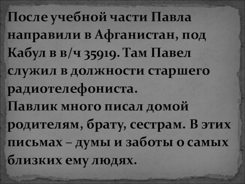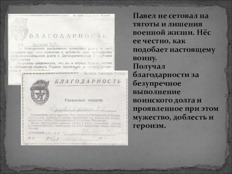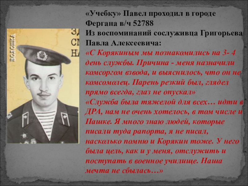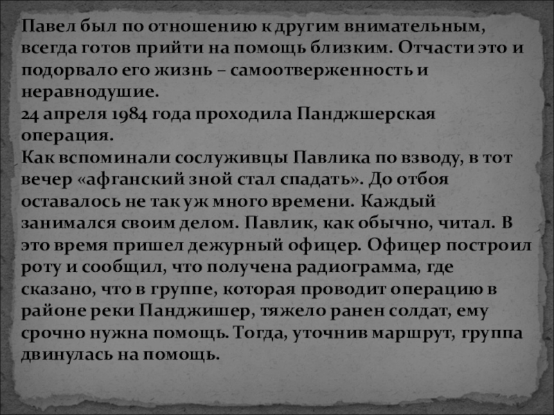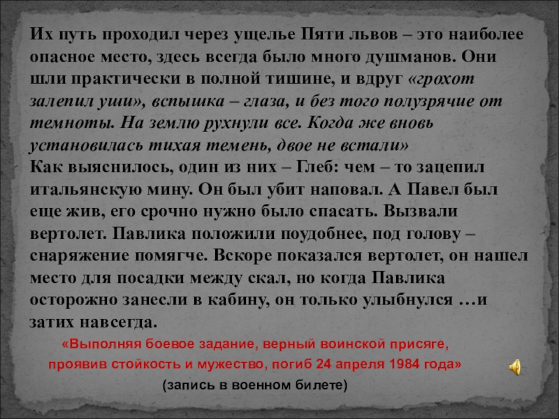 «Выполняя боевое задание, верный воинской присяге, проявив стойкость и мужество, погиб 24 апреля 1984 года»