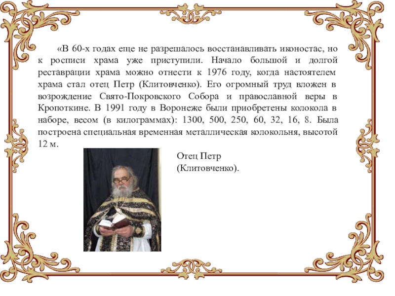 храма уже приступили. Начало большой и долгой реставрации храма можно отнести к 1976 году, когда настоятелем храма стал отец Петр (Клитовченко). Его огромный труд вложен в возрождение Свято-Покровского Собора и православной веры в Кропоткине. В 1991 году в Воронеже были приобретены колокола в наборе, весом (в килограммах): 1300, 500, 250, 60, 32, 16, 8. Была построена специальная временная металлическая колокольня, высотой 12 м.