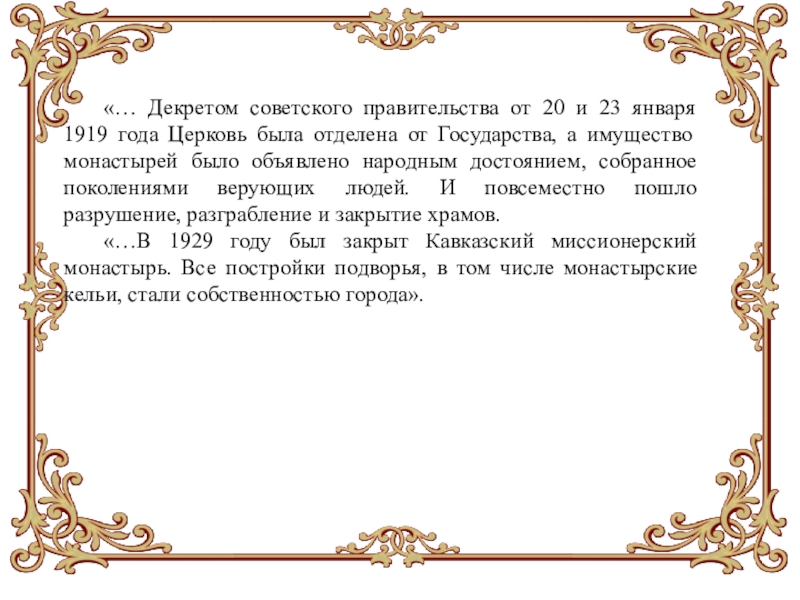«…В 1929 году был закрыт Кавказский миссионерский монастырь. Все постройки подворья, в том числе монастырские кельи, стали собственностью города».