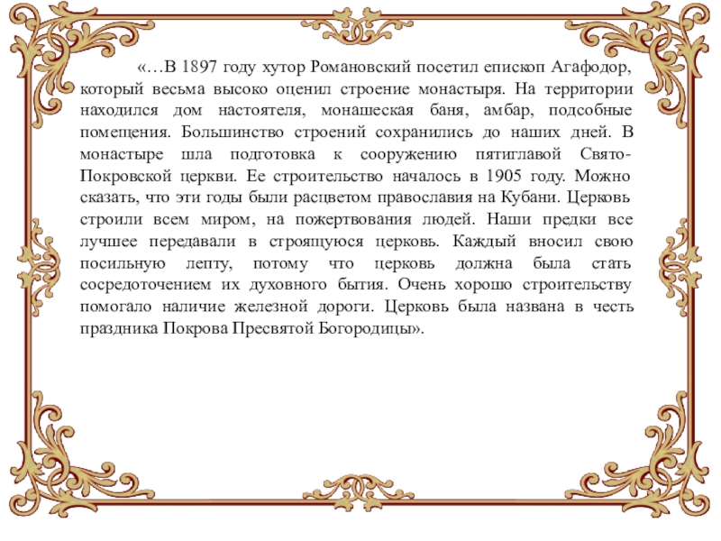 Слайд 12 «…В 1897 году хутор Романовский посетил епископ Агафодор, который