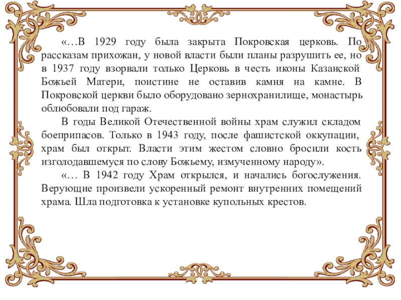 Слайд 15«…В 1929 году была закрыта Покровская церковь. По рассказам прихожан, у