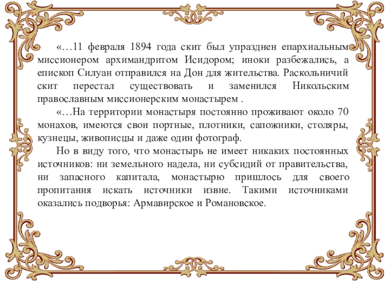 «…11 февраля 1894 года скит был упразднен епархиальным миссионером архимандритом Исидором;