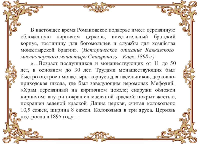 братский корпус, гостиницу для богомольцев и службы для хозяйства монастырской братии». (Историческое описание Кавказского миссионерского монастыря Ставрополь – Кавк. 1898 г.)