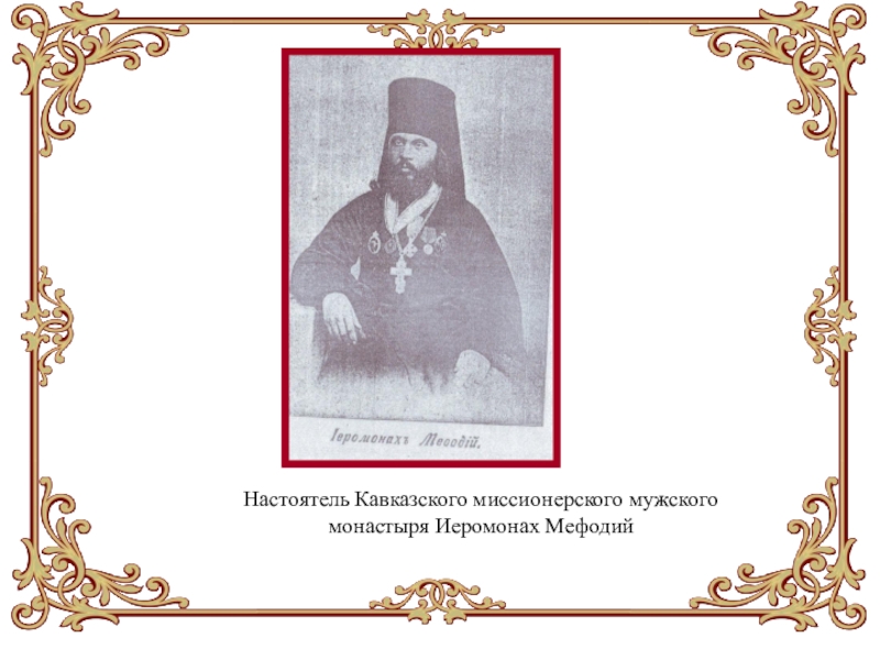 Слайд 4Настоятель Кавказского миссионерского мужского монастыря Иеромонах Мефодий