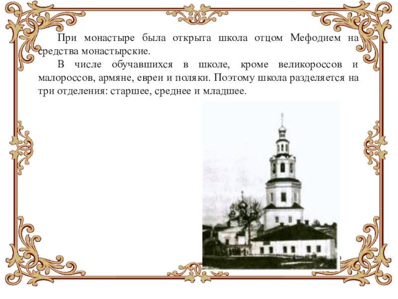 При монастыре была открыта школа отцом Мефодием на средства монастырские.