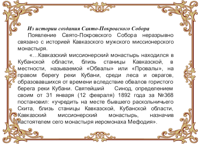 «…Кавказский миссионерский монастырь находился в Кубанской области, близь станицы Кавказской, в местности, называемой «Обвалы» или «Провалы», на правом берегу реки Кубани, среди леса и оврагов, образовавшихся от времени вследствие обвалов гористого берега реки Кубани. Святейший Синод, определением своим от 31 января (12 февраля) 1892 года за №368 постановил: «учредить на месте бывшего раскольничьего Скита, близь станицы Кавказской, Кубанской области, Кавказский миссионерский монастырь, назначив настоятелем сего монастыря иеромонаха Мефодия».
