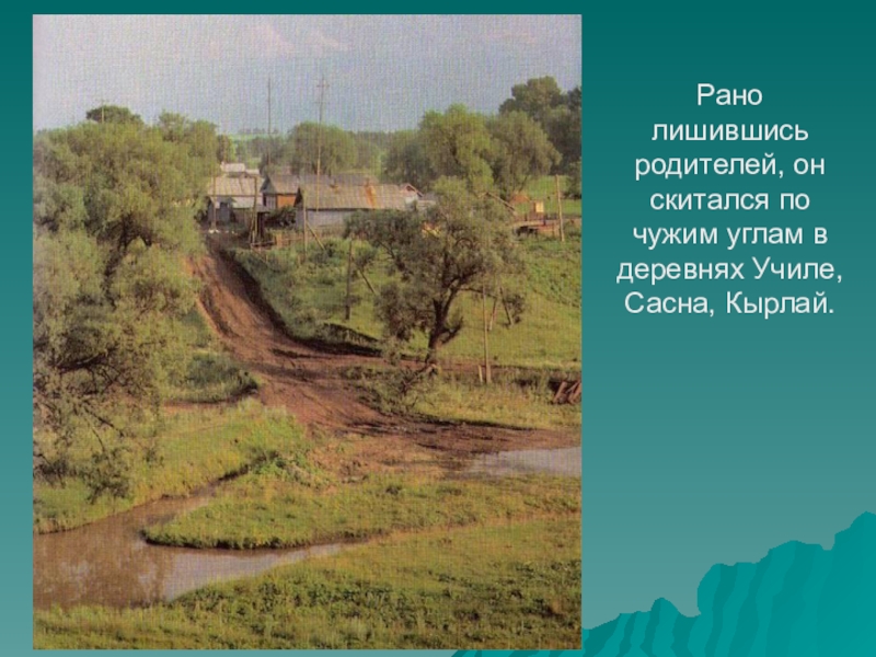 Слайд 5Рано лишившись родителей, он скитался по чужим углам в деревнях Училе,
