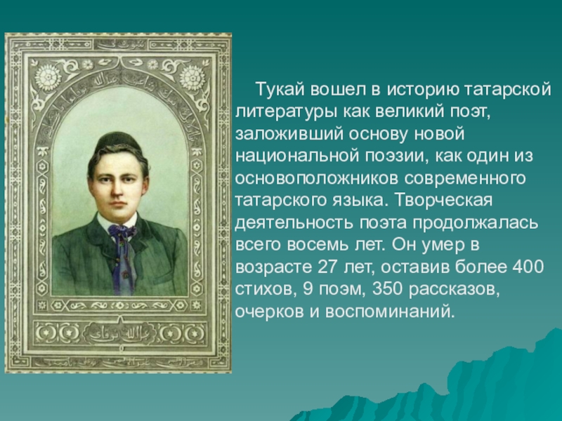 Слайд 27    Тукай вошел в историю татарской литературы как великий поэт, заложивший