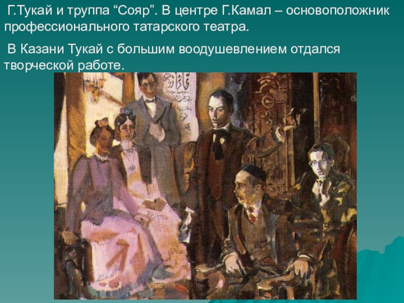 Слайд 16 Г.Тукай и труппа “Сояр”. В центре Г.Камал – основоположник профессионального