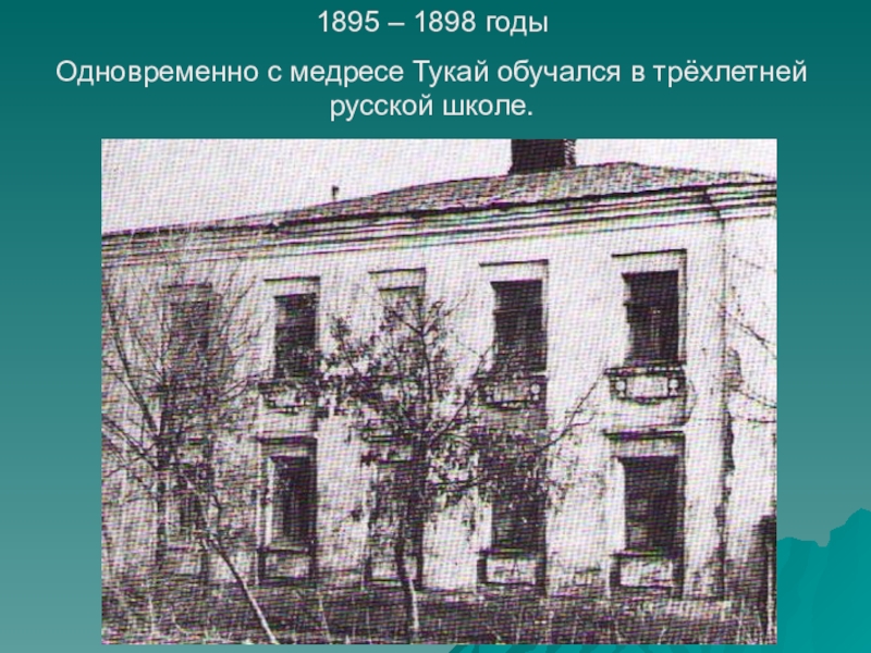 1895 – 1898 годыОдновременно с медресе Тукай обучался в трёхлетней русской школе.