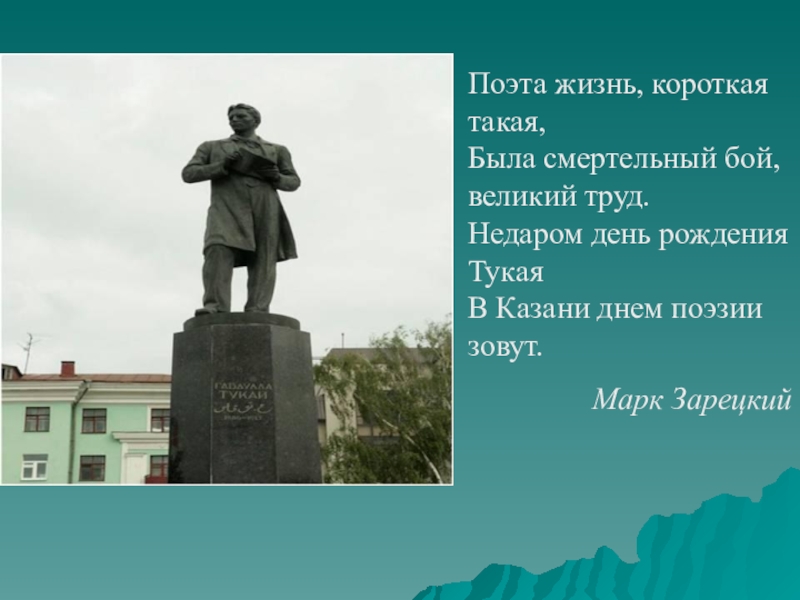 Поэта жизнь, короткая такая, Была смертельный бой, великий труд. Недаром день рождения Тукая В Казани днем поэзии зовут. Марк Зарецкий