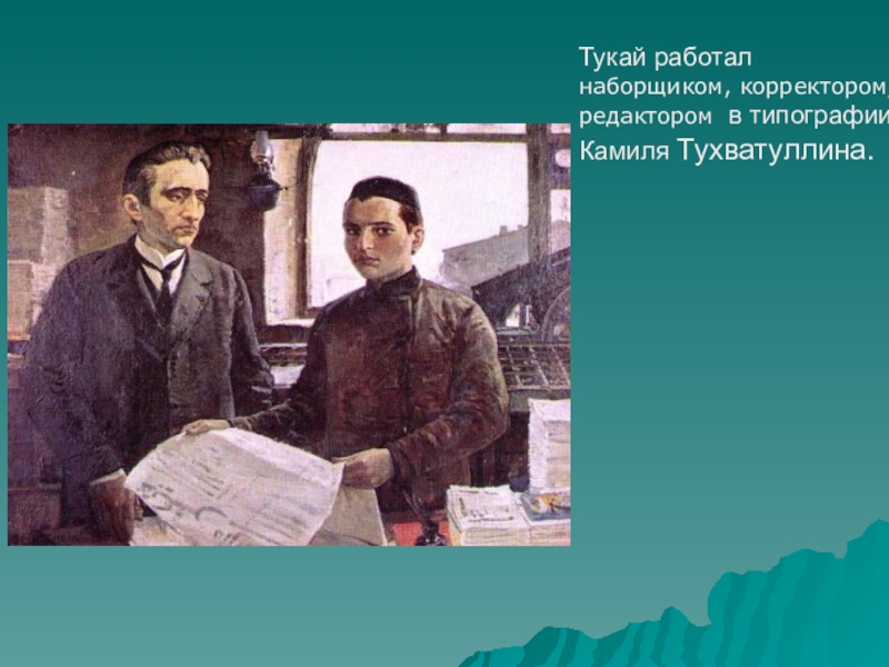 Слайд 14Тукай работал наборщиком, корректором, редактором в типографии Камиля Тухватуллина.