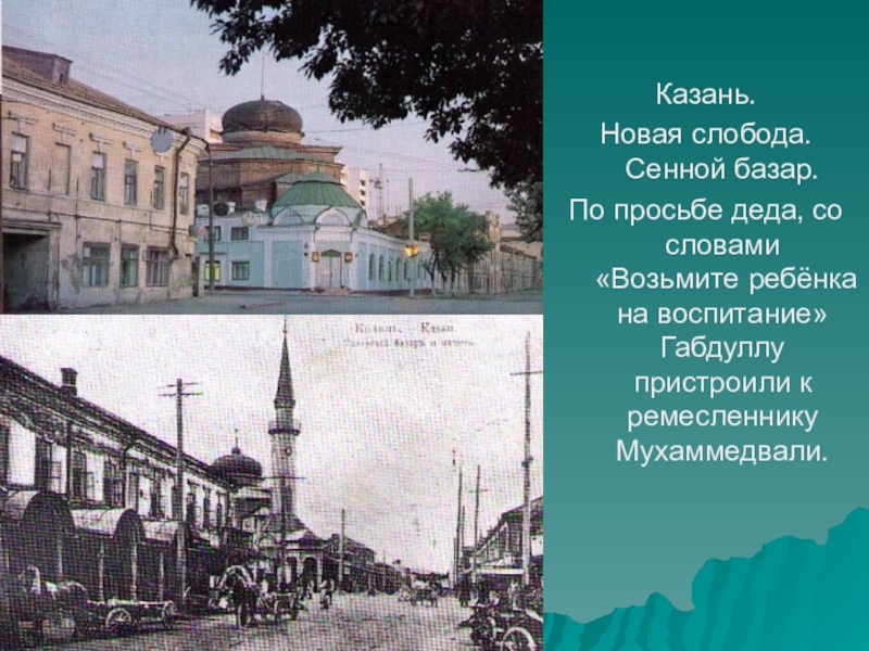 Казань. Новая слобода. Сенной базар.По просьбе деда, со словами «Возьмите ребёнка на воспитание» Габдуллу пристроили к ремесленнику