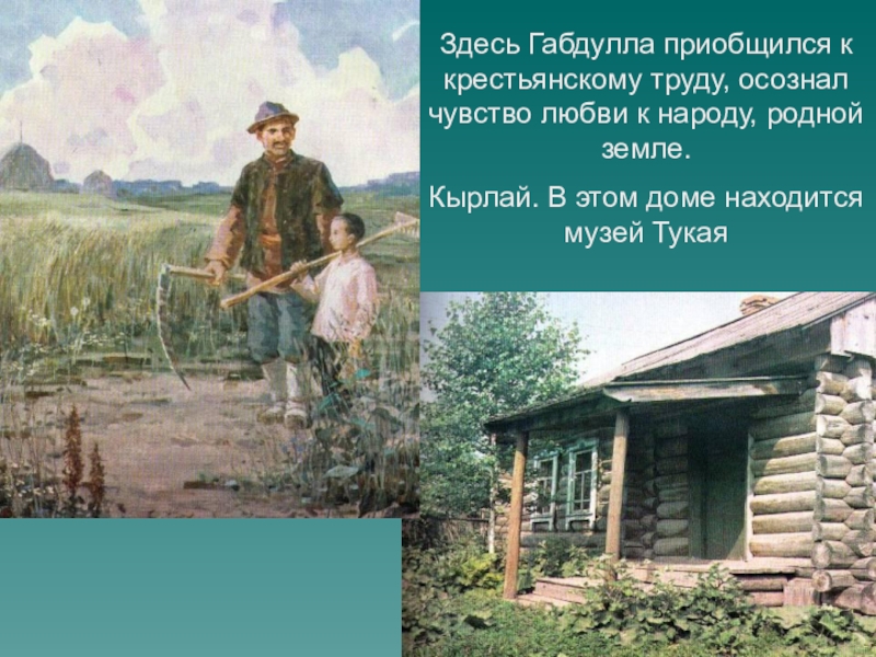 Слайд 9Здесь Габдулла приобщился к крестьянскому труду, осознал чувство любви к народу,