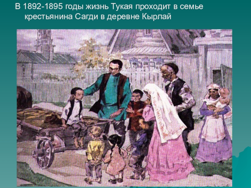 В 1892-1895 годы жизнь Тукая проходит в семье крестьянина Сагди в деревне Кырлай