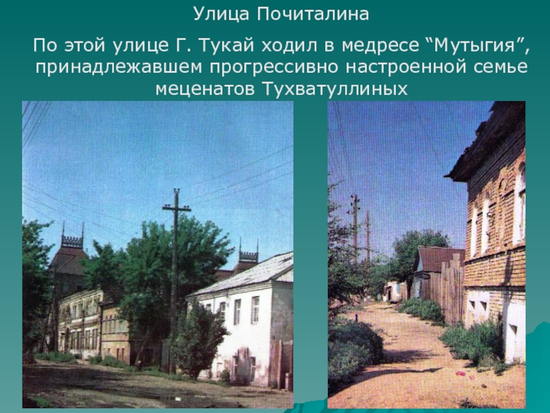 Улица ПочиталинаПо этой улице Г. Тукай ходил в медресе “Мутыгия”, принадлежавшем прогрессивно настроенной семье меценатов Тухватуллиных