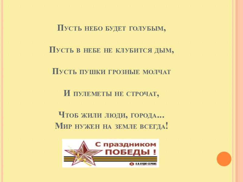 Мы живем в мирное время. Над нами мирное небо, ласковое солнце. Мы не должны забывать тех, кто подарил нам все это, кто ценой своей жизни подарил нам мир.