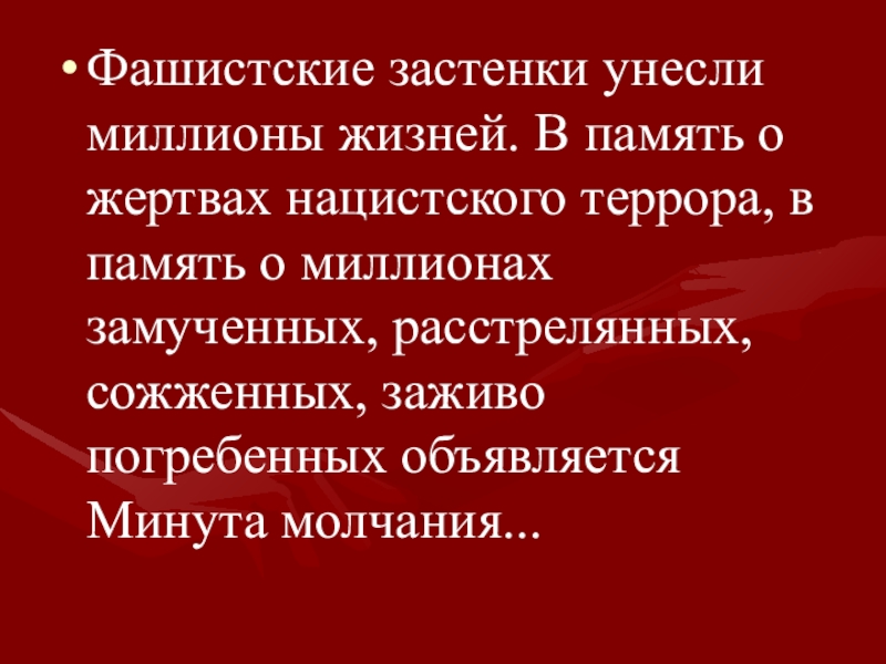 в память о миллионах замученных, расстрелянных, сожженных, заживо погребенных объявляется Минута молчания...