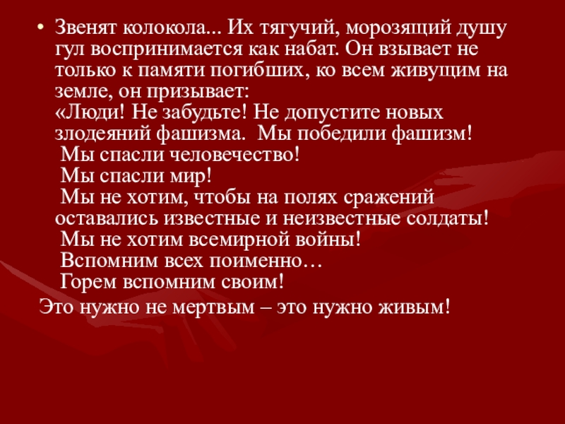 Звенят колокола... Их тягучий, морозящий душу гул воспринимается как набат. Он взывает не только к памяти погибших,