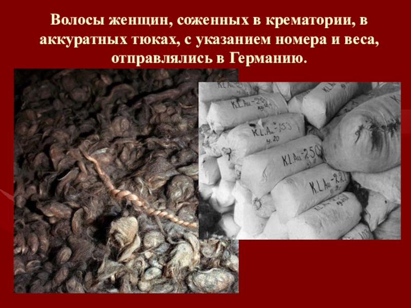 Волосы женщин, соженных в крематории, в аккуратных тюках, с указанием номера и веса, отправлялись в Германию.