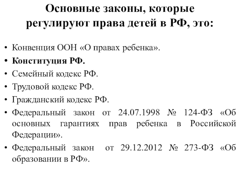 Основные законы, которые регулируют права детей в РФ, это:Конвенция ООН «О правах ребенка».Конституция РФ.Семейный кодекс РФ.Трудовой кодекс РФ.Гражданский кодекс РФ.Федеральный закон от 24.07.1998 № 124-ФЗ «Об основных гарантиях прав ребенка в Российской Федерации».Федеральный закон   от 29.12.2012