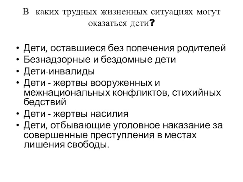 В каких трудных жизненных ситуациях могут оказаться дети? Дети, оставшиеся без попечения родителейБезнадзорные и бездомные детиДети-инвалидыДети -
