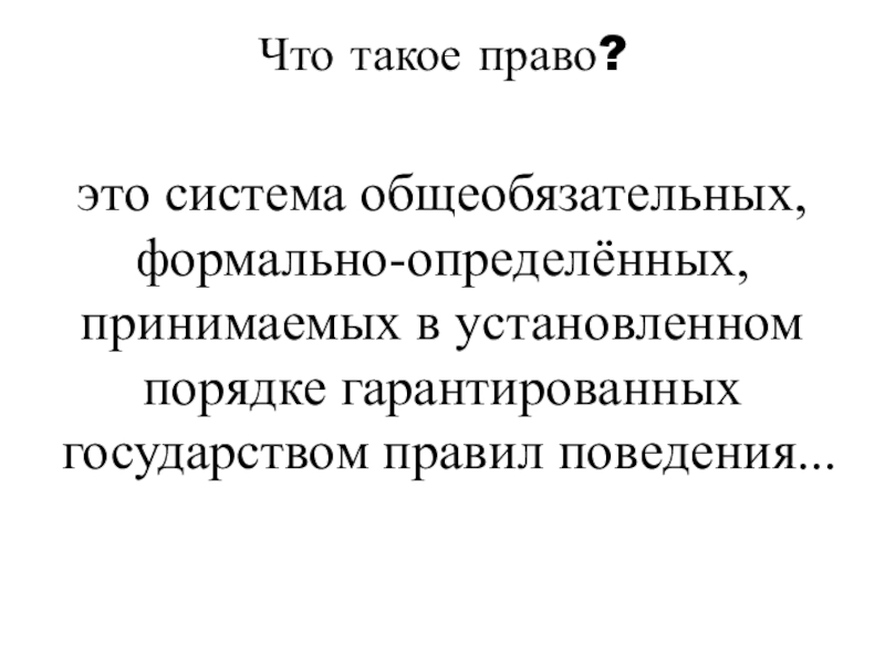 Что такое право? это система общеобязательных, формально-определённых, принимаемых в установленном порядке гарантированных государством правил поведения...