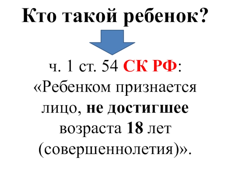 Кто такой ребенок?ч. 1 ст. 54 СК РФ: «Ребенком признается лицо, не достигшее возраста 18 лет (совершеннолетия)».