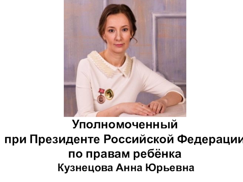 Слайд 14Уполномоченный при Президенте Российской Федерации по правам ребёнка Кузнецова Анна Юрьевна