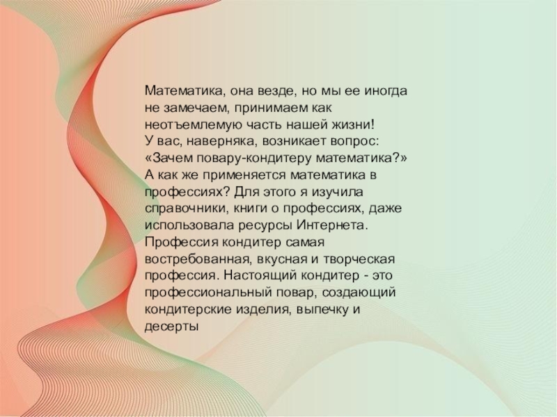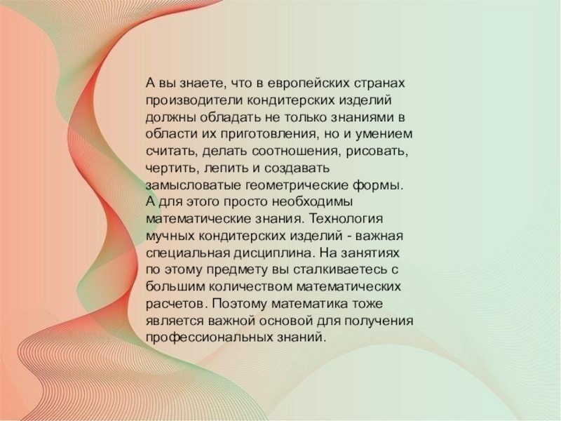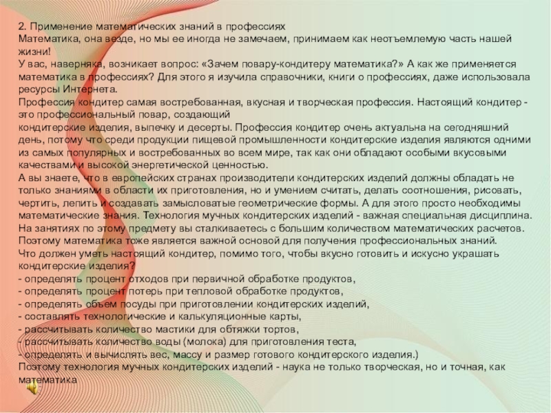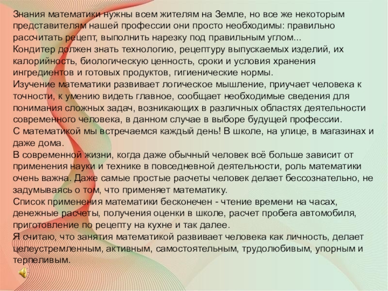Знания математики нужны всем жителям на Земле, но все же некоторым представителям нашей профессии они просто необходимы: правильно рассчитать рецепт, выполнить нарезку под правильным углом...