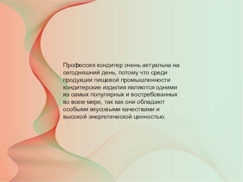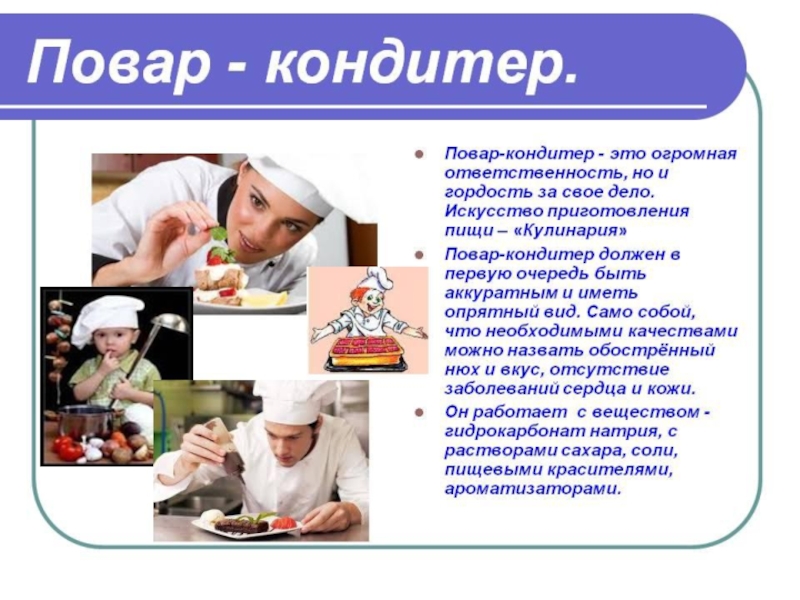 Кондитер должен знать технологию, рецептуру выпускаемых изделий, их калорийность, биологическую ценность, сроки и условия хранения ингредиентов и готовых продуктов, гигиенические нормы.