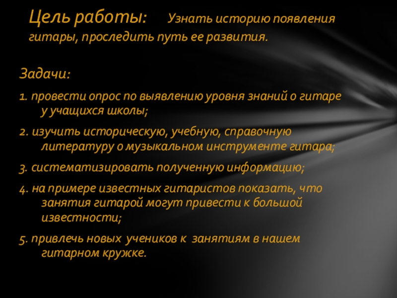 Цель работы: Узнать историю появления гитары, проследить путь ее развития.