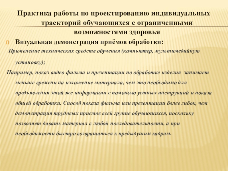 Например, показ видео фильма и презентации по обработке изделия занимает меньше времени на изложение материала, чем это необходимо для предъявления этой же информации с помощью устных инструкций и показа общей обработки. Способ показа фильма или презентации более гибок, чем демонстрация трудовых приемов всей группе обучающихся, поскольку позволяет давать материал в любой последовательности, а при необходимости быстро возвращаться к предыдущим кадрам.